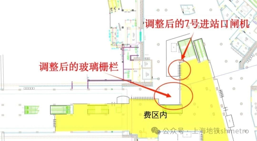 为解决这一问题,车站对原7号口进站闸机及周边玻璃栏杆进行调整,拆除5、6号口出站闸机右侧玻璃栏杆,打通了两组闸机间的通道。据测算,新通道从5、6号口出站闸机至7号口进站闸机的步行时间缩短约3分钟。