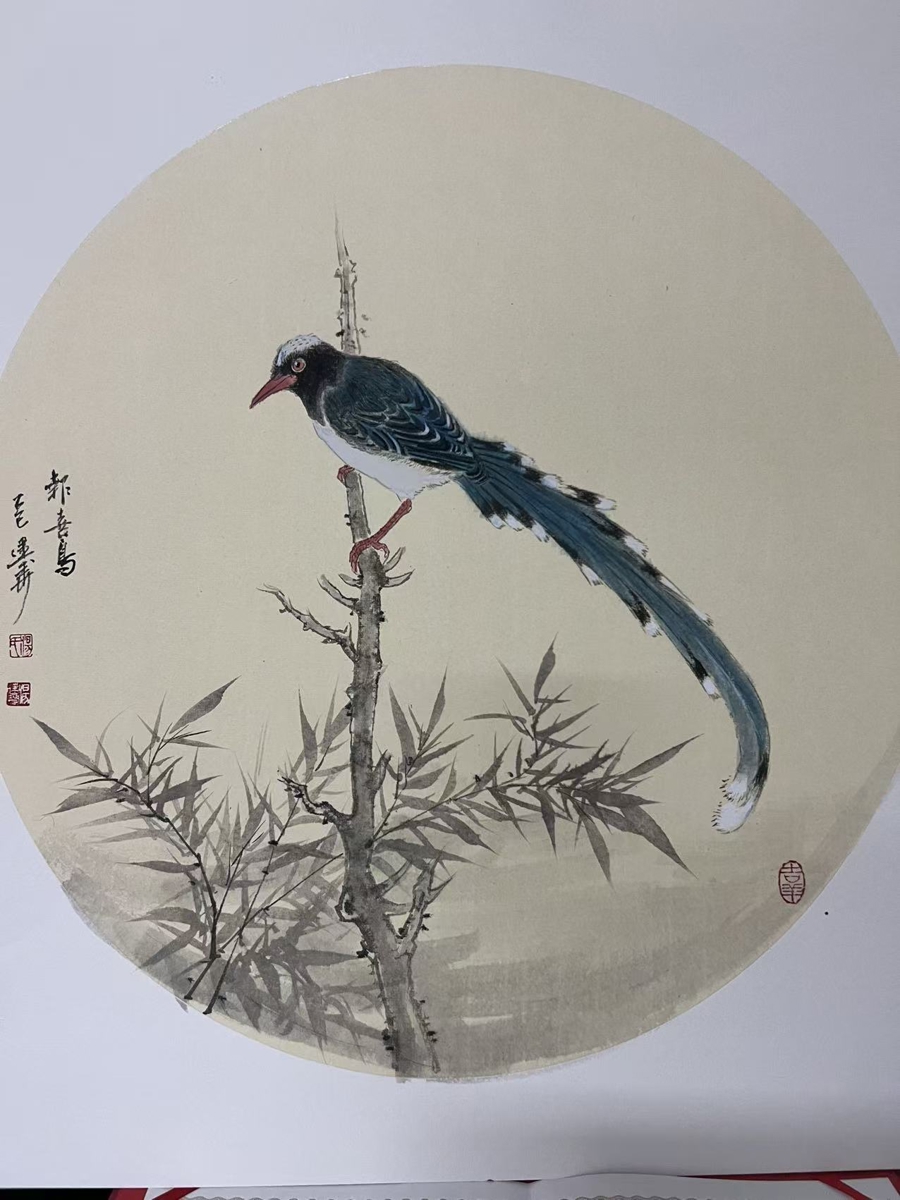 画展现场,一幅红嘴蓝鹊主题画作尽显传统意蕴与灵动美感。红嘴蓝鹊自古被视作报喜鸟,承载“报喜传吉、驱邪纳福”的吉祥寓意,是传统文化中祥瑞的象征。